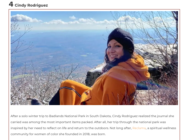 Cindy Y. Rodriguez is the founder and creator of Reclama. Reclama is a spiritual wellness community helping women of color reclaim themselves through hiking and journaling.